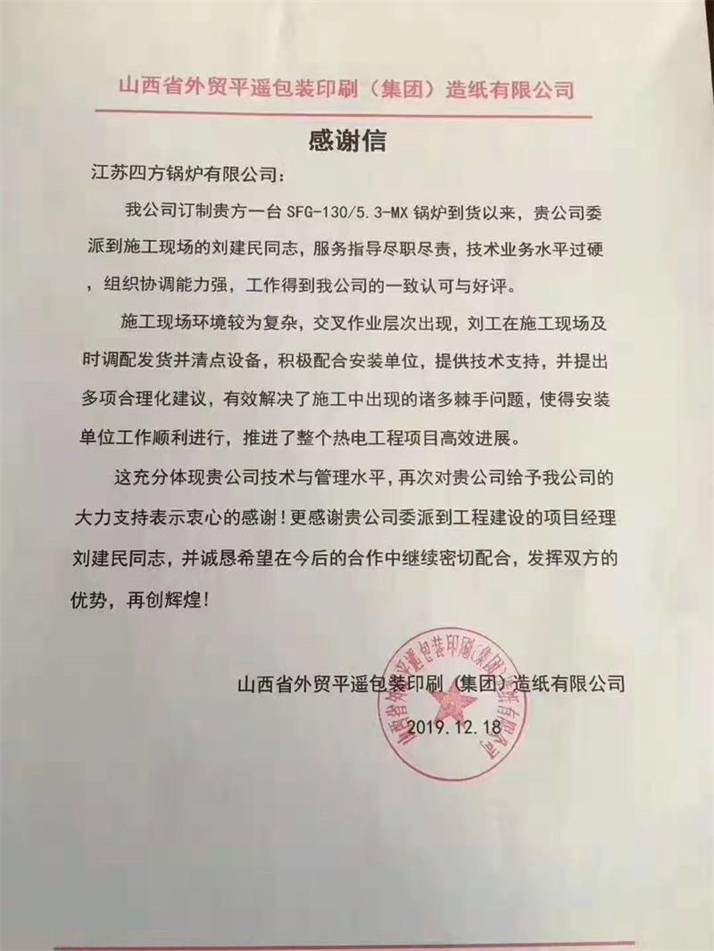 12月18日,一封熱情洋溢的感謝信,從陜西省外貿平遙包裝印刷(集團)造紙有限公司發(fā)出,盛贊江蘇四方鍋爐對130T/H循環(huán)流化床鍋爐山西平遙熱電工程項目,在技術與管理等方面提供的大力支持。項目經理——該公司工程部選派的劉建民同志“得到一致認可與好評”。目前,該熱電工程項目正高效推進。