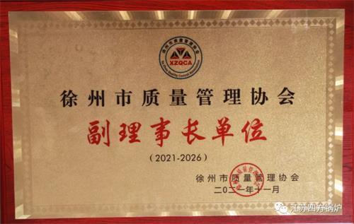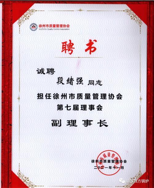 2022年1月16日,在徐州市質(zhì)量管理協(xié)會第七屆理事會第一次會議暨授牌頒證儀式上,江蘇四方鍋爐當(dāng)選協(xié)會當(dāng)選副理事長單位,公司董事長段緒強(qiáng)受聘協(xié)會副理事長。
