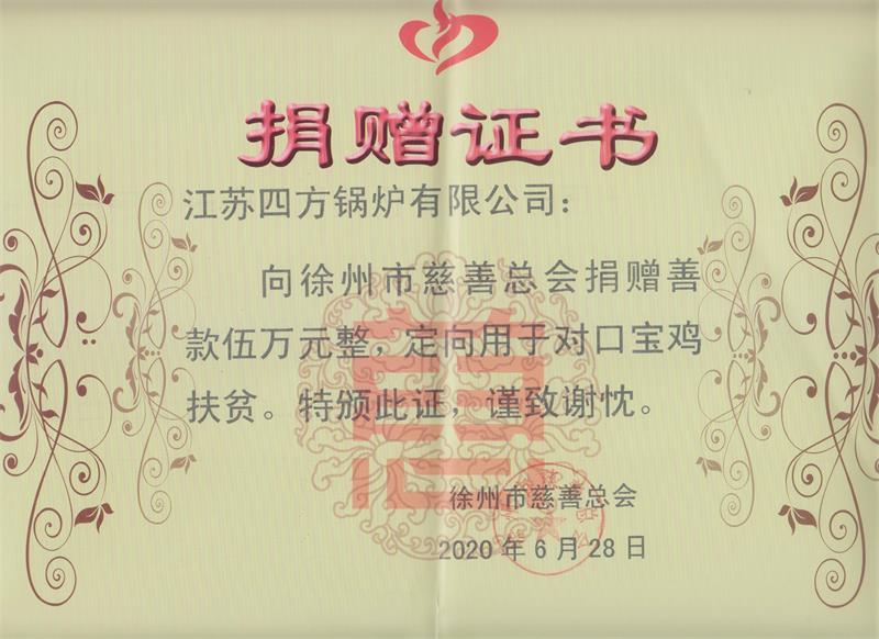 江蘇四方鍋爐社會(huì)責(zé)任又擔(dān)當(dāng),扶貧捐贈(zèng)新奉獻(xiàn)——通過徐州市慈善總會(huì),向陜西寶雞對(duì)口幫扶慈善捐贈(zèng)50000元。近日,徐州市慈善總會(huì)頒發(fā)捐贈(zèng)證書,謹(jǐn)致謝枕、激勵(lì)。