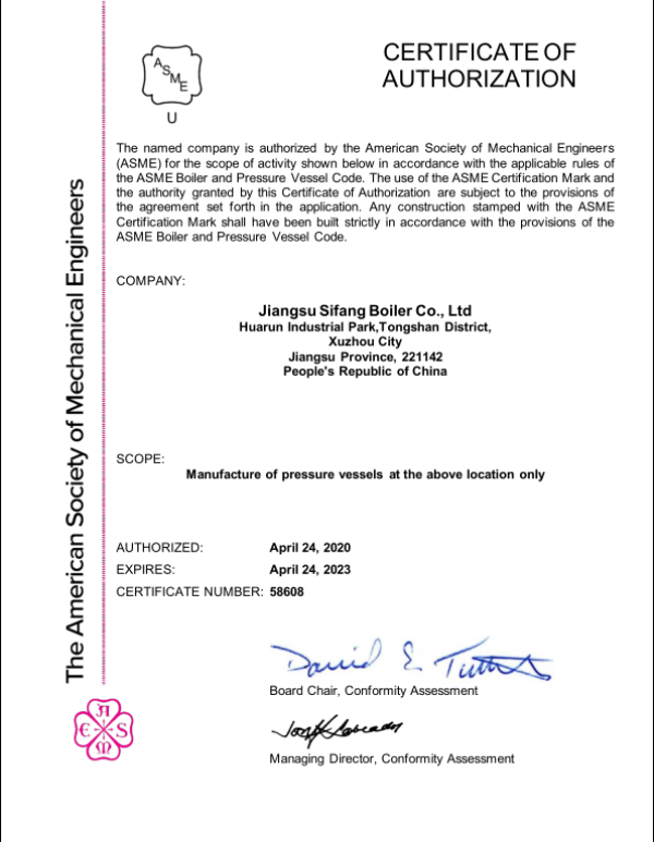 本次新又順利通過ASME S\U取證審核,是江蘇四方鍋爐繼2014年成功取得S/U鋼印設計制造授權(quán)證書后的又一次跨越性突破。相較于之前授權(quán)證書,本次鋼印授權(quán)后,江蘇四方鍋爐主要產(chǎn)品呈現(xiàn)適用范圍更廣、能效品質(zhì)性能更優(yōu)、市場競爭性強等特點。