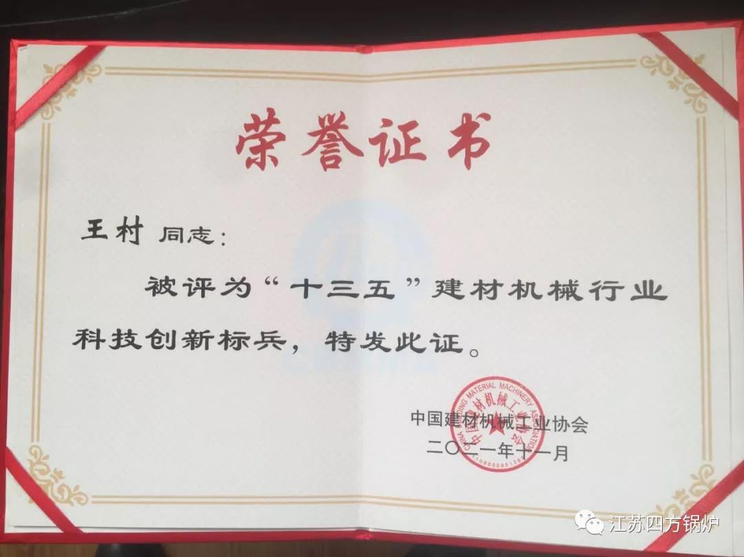 本次會議上,對“十三五”建材機械行業(yè)10家科技創(chuàng)新領(lǐng)軍企業(yè)、15家科技創(chuàng)新標(biāo)兵企業(yè)、5家配備件優(yōu)秀供應(yīng)商,以及10名科技創(chuàng)新領(lǐng)軍人才、15名科技創(chuàng)新標(biāo)兵;2021年建材機械行業(yè)科技獎等進(jìn)行了表彰,頒發(fā)了獎牌和證書。江蘇四方鍋爐榮獲“十三五”建材機械行業(yè)“科技創(chuàng)新企業(yè)”標(biāo)兵稱號,王村被評為“十三五”建材機械行業(yè)“科技創(chuàng)新標(biāo)兵”。